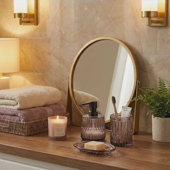 Elevate your bathroom aesthetics with this sophisticated glass bathroom set in a soft blush tone. This curated collection includes a tumbler for everyday use, a sleek dispenser for soaps and lotions, and a practical soap dish—each piece crafted from quality glass that combines durability with refined elegance. The cohesive design creates a polished, coordinated look while the deep green hue adds a natural, calming presence to your space. Perfect for those who appreciate functional design with understated luxury.