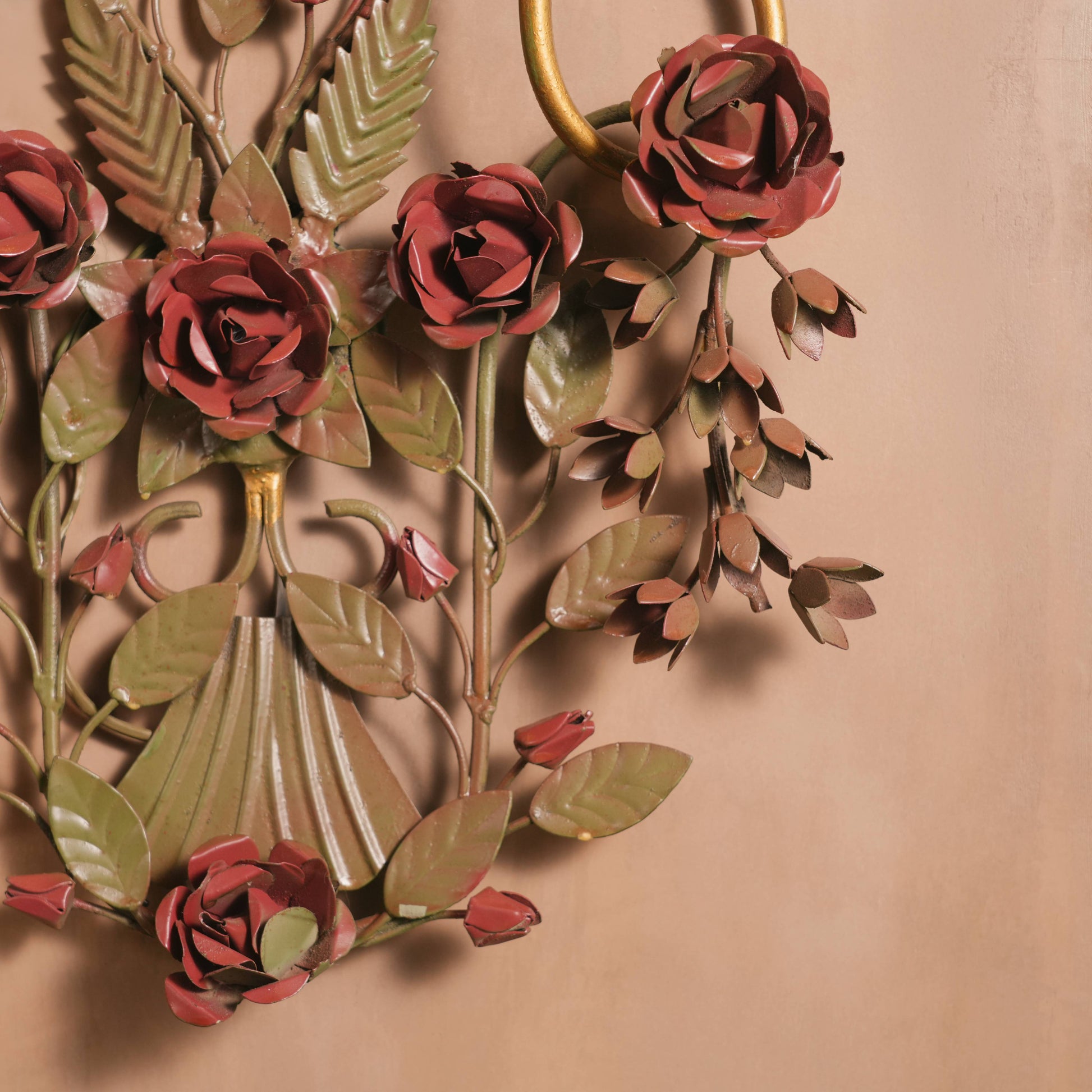 An ornate handcrafted wall sconce featuring layered metal leaves and sculpted rose motifs. Designed to hold twin bulbs, it casts a warm, romantic glow while adding depth and drama to the wall. Ideal for hallways, bedrooms, or living spaces, it brings vintage charm and artisanal elegance to interiors.