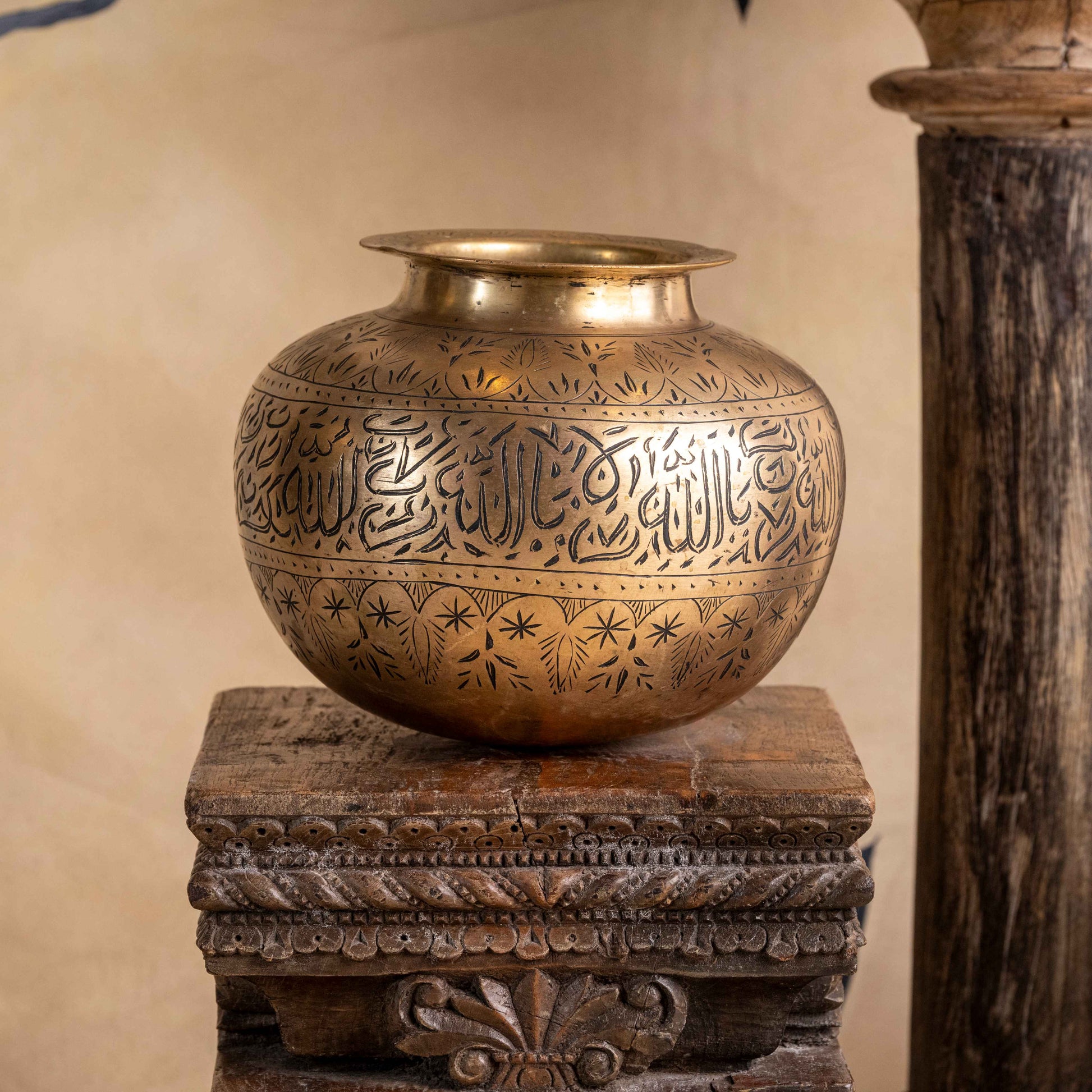 Crafted from bronze, this exquisite vintage pot features intricate Arabic calligraphy inscriptions that reflect a rich cultural heritage. Ideal as a collectible artifact, it combines artistic elegance with historical significance, making it a distinguished piece for connoisseurs and enthusiasts of such art. Its robust bronze construction ensures durability, while the finely detailed inscriptions showcase exceptional craftsmanship. Perfect for display as is or to hold your favourite blooms!