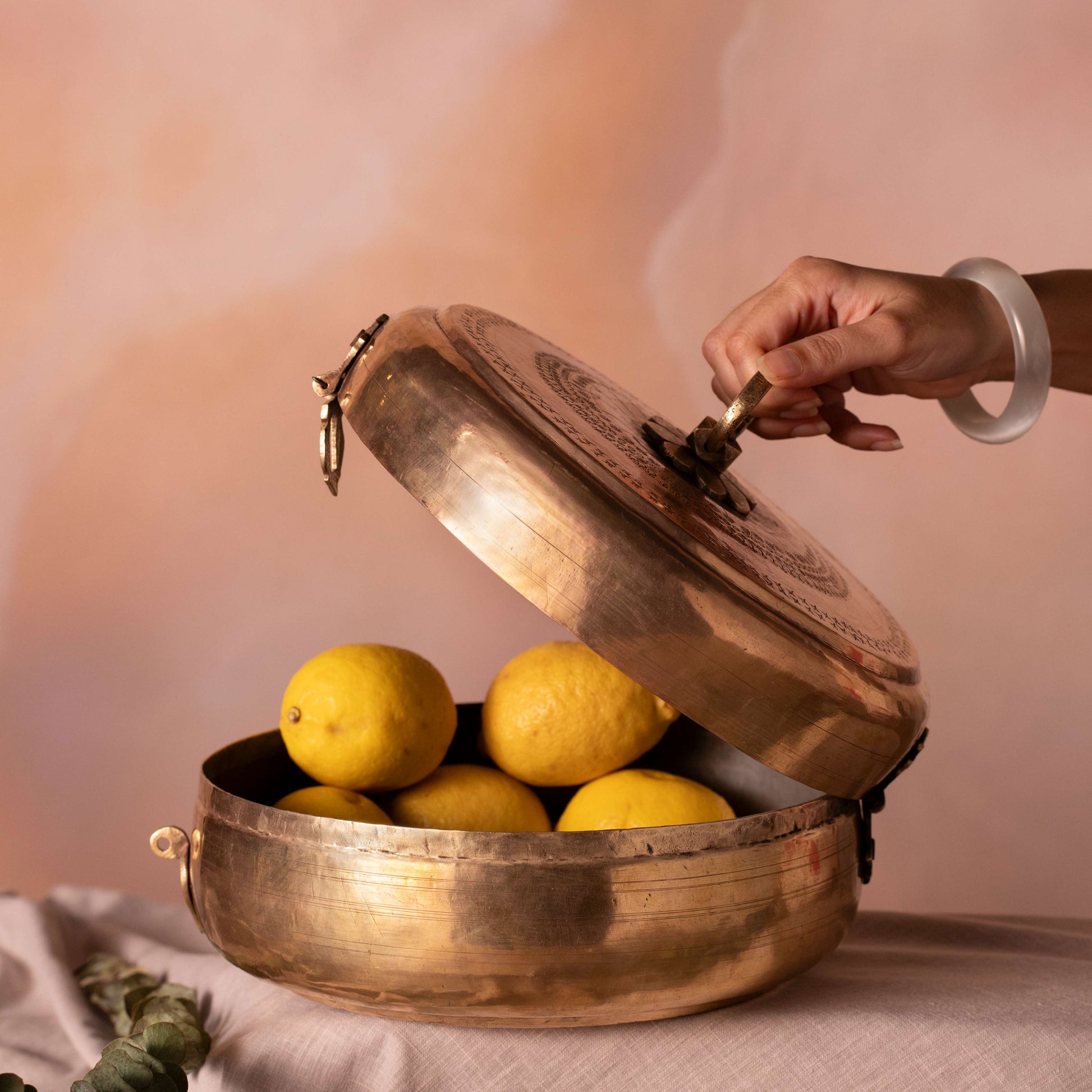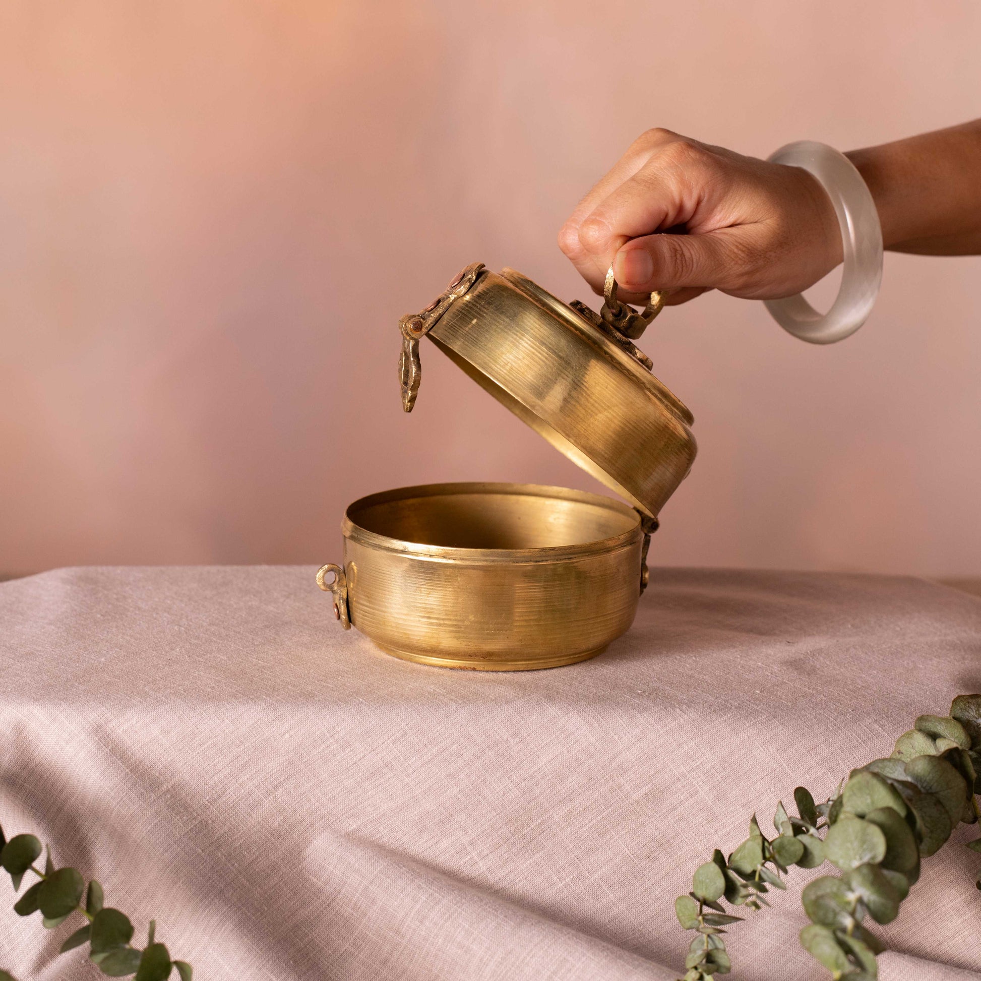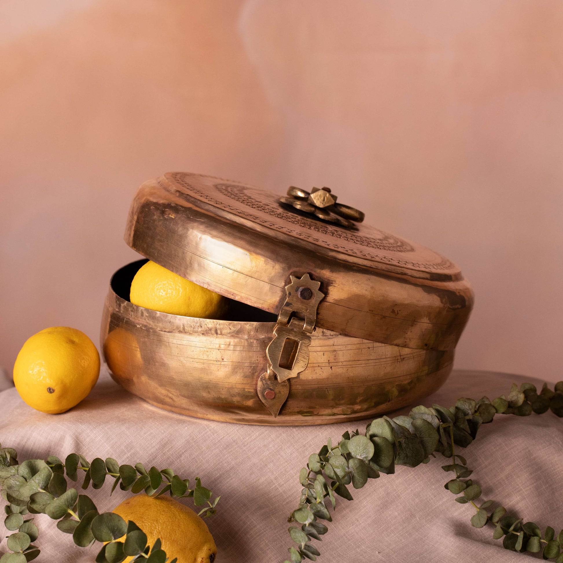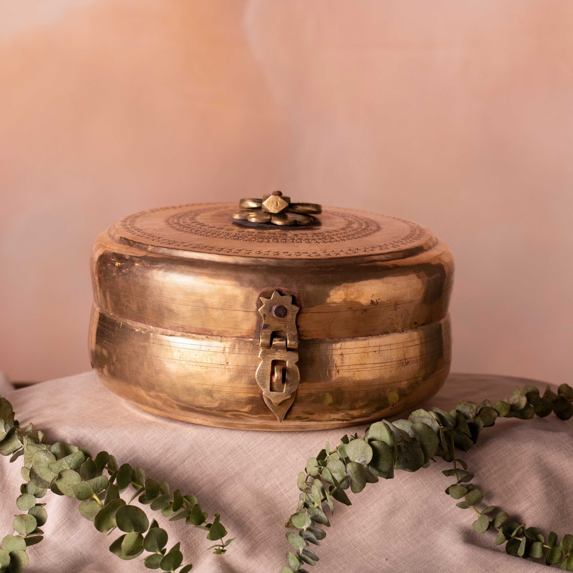 Indulge in the rich heritage of India with our vintage brass Chapati Box. Keep your chapatis fresh and warm in style, adding an elegant touch to your dining experience. The perfect addition to your home for those who appreciate sophistication and luxury. You can use it as a trinket box or a stationery box too if you don't want to limit it for the originally intended use.