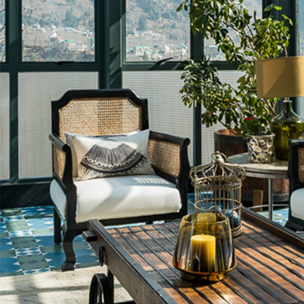 - This oversized cane and teakwood chair is perfect for your home or office too. Place a pair with your sofa for a great setup.