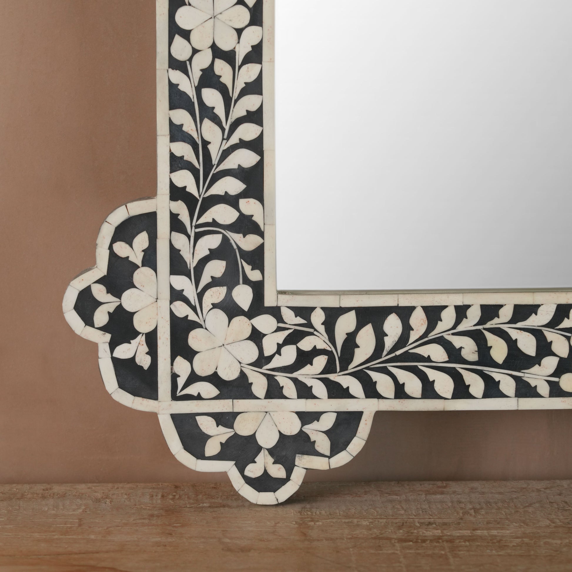 A handcrafted bone inlay mirror featuring intricate floral patterns in striking contrast. Framed with traditional craftsmanship and elegant detailing, it adds depth, light, and artistry to any space. Perfect for foyers, bedrooms, or living areas, it serves as both a functional mirror and a statement décor piece.