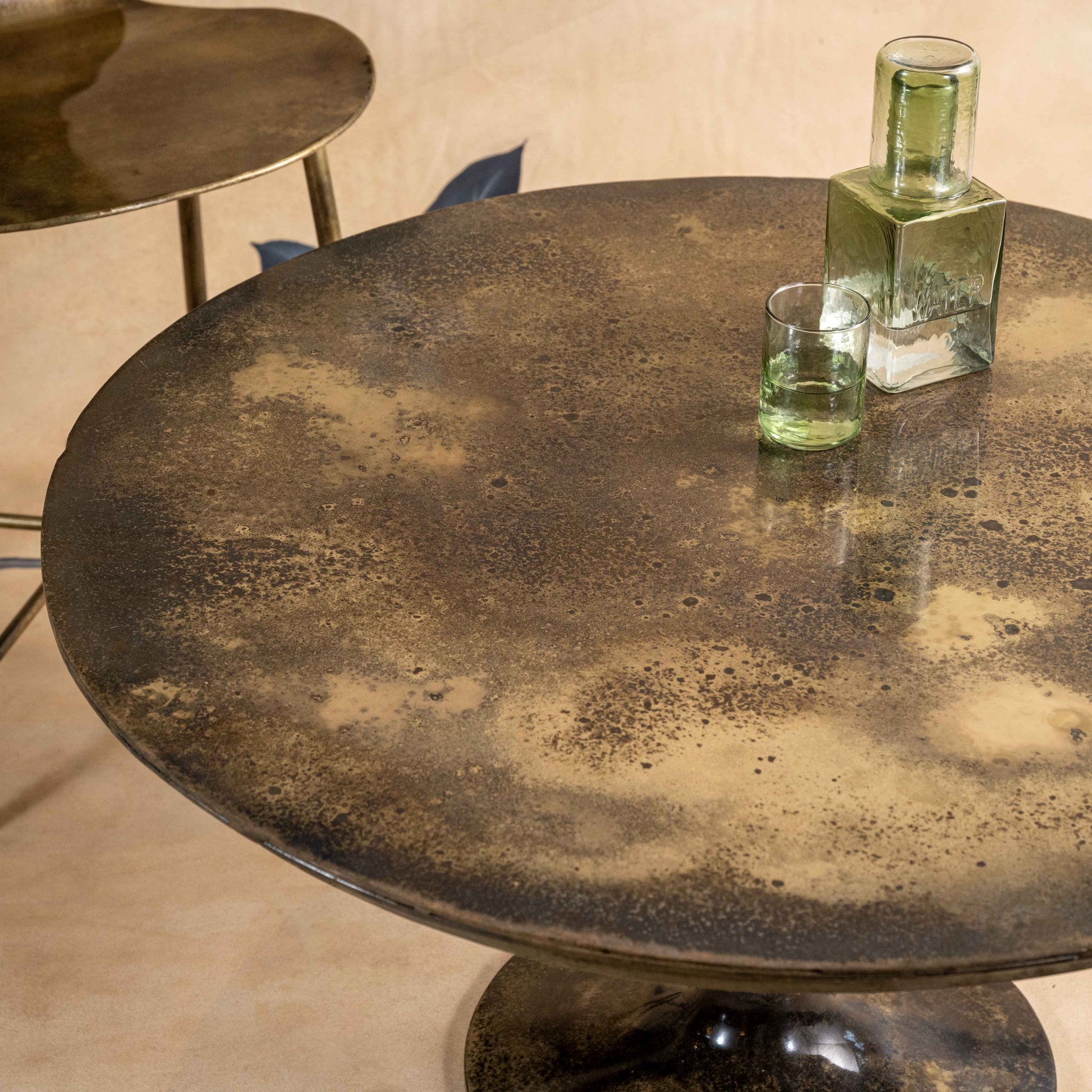 The Rustic Coffee Table features a striking round design perfect for semi-open spaces, blending elegance with functionality. Its black and gold distressed finish adds a sophisticated touch, creating a timeless centerpiece that complements a variety of interiors while offering durable style.