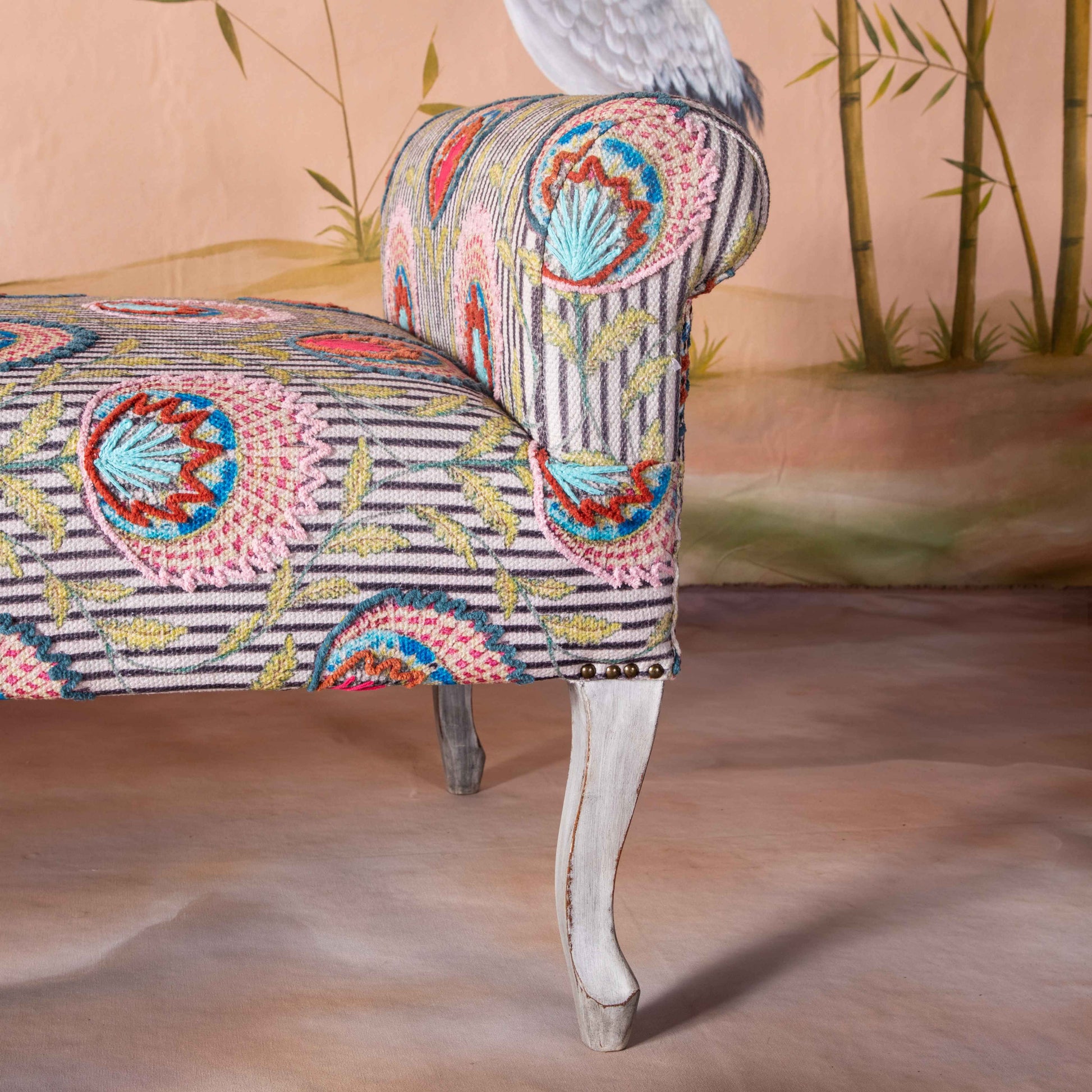The Kandy Chaise combines elegance with comfort, featuring a refined striped fabric enhanced by delicate embroidery. Its sophisticated design makes it a perfect statement piece for any living space, offering both style and relaxation. Crafted to elevate your interior with expert attention to detail, this chaise balances aesthetic appeal with functional seating.