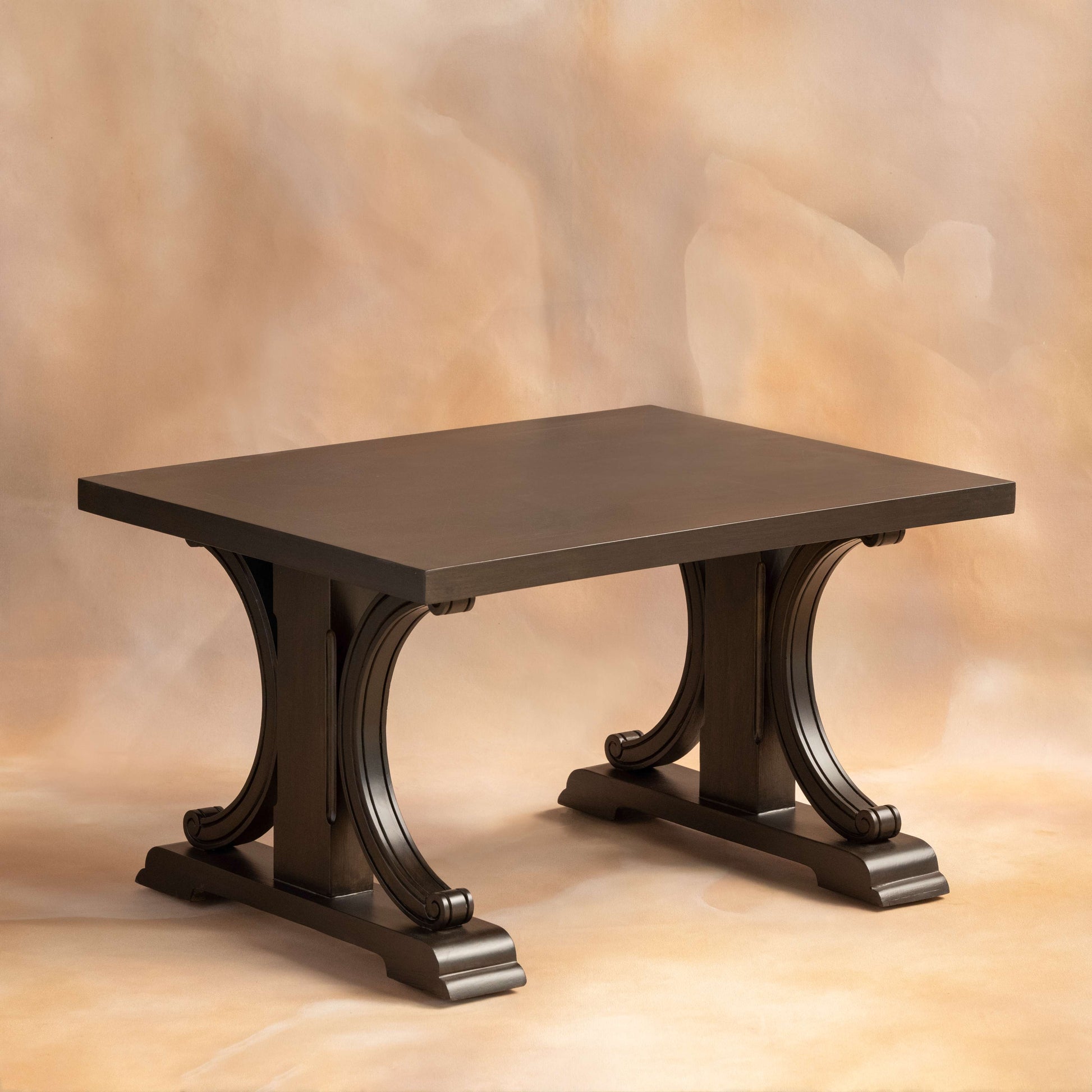 - Made from Burma teakwood and with a finish customized to your taste, this compact table is perfect for small spaces. Its exquisite detailing adds a touch of sophistication to any room.