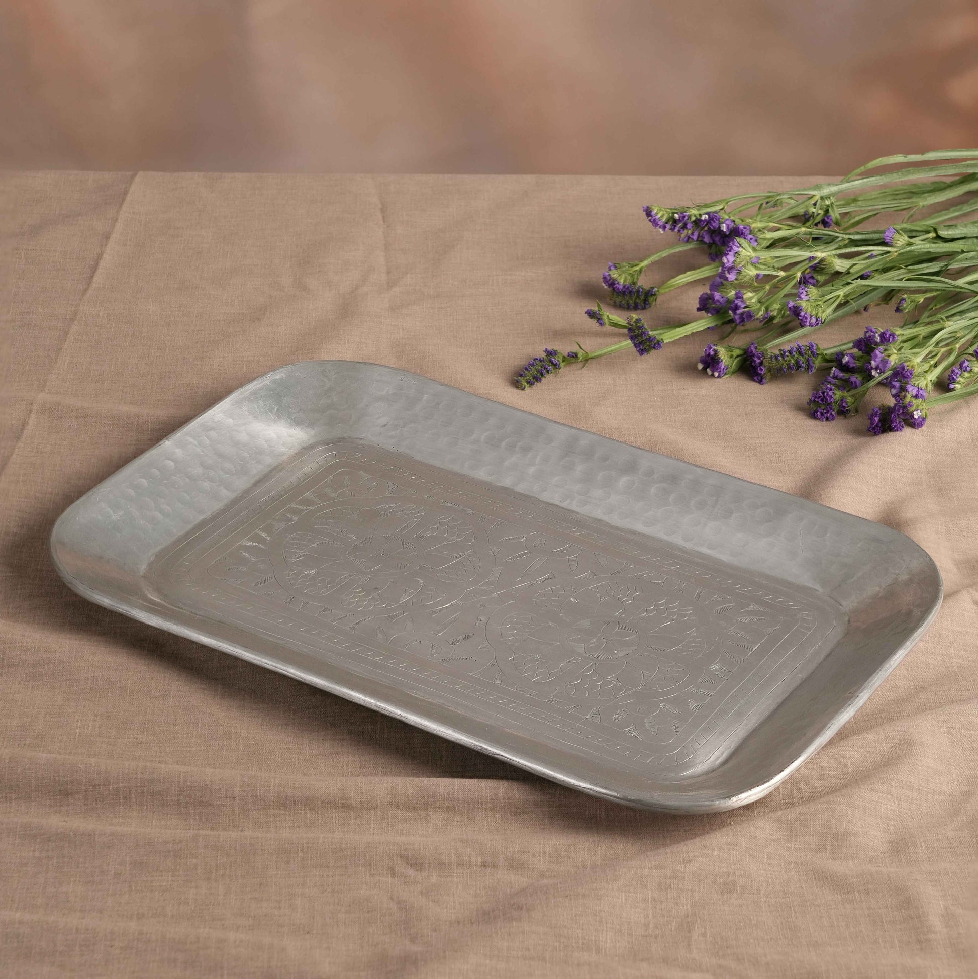 The Moonleaf Tray combines elegant craftsmanship with festive charm, featuring a silver finish complemented by beautifully hammered edges. Expertly engraved, this tray adds a sophisticated touch to your celebratory gatherings, perfect for serving or display. Its refined design enhances any setting, making it an essential piece for festive occasions.