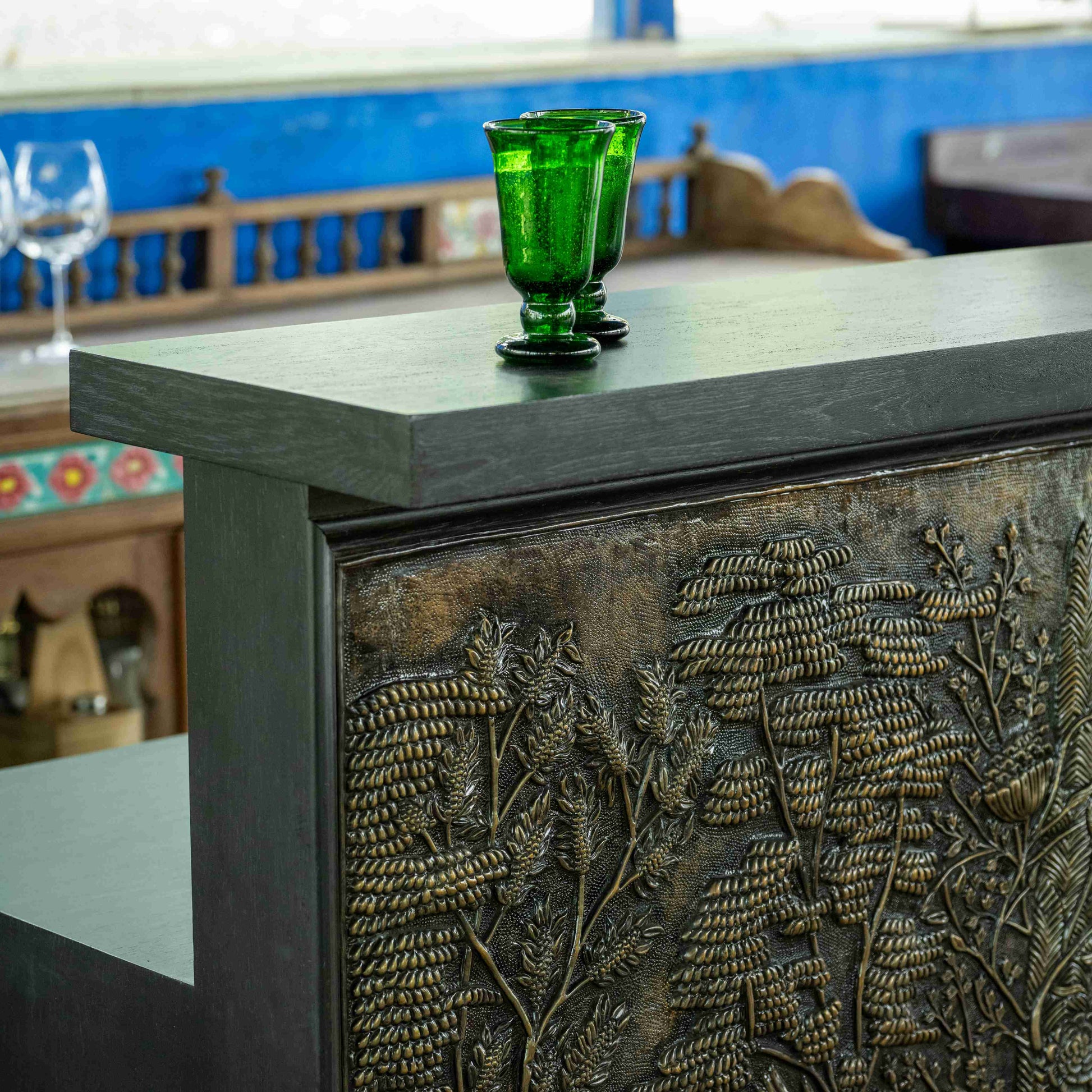 Elevate your space with this expertly crafted bar, a striking statement piece with the facade made from hand-beaten brass with beautiful Indian motifs. Its artisan finish showcases skilled craftsmanship, adding both texture and timeless style to your interiors. Designed for those who appreciate refined details, this bar combines functionality with a distinctive aesthetic that enhances any setting.