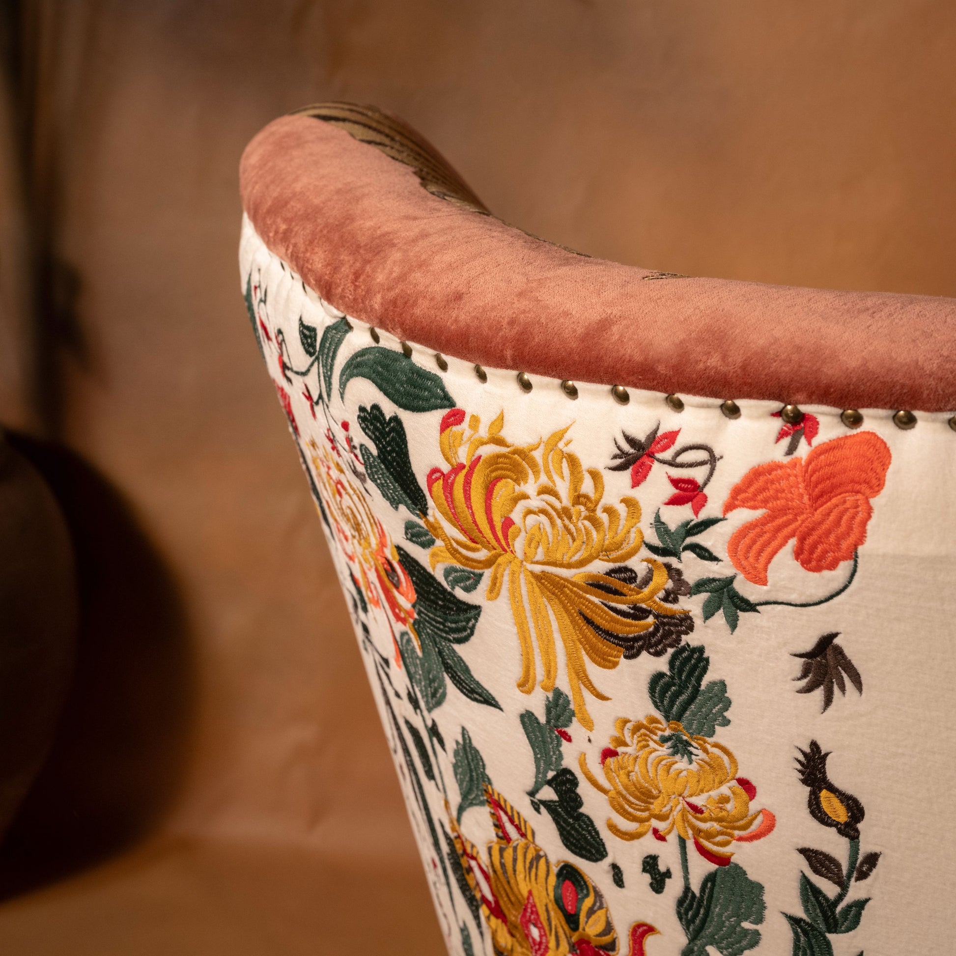 Elevate your living space with the Nyoma Chair, a bold fusion of luxury and wilderness. Crafted in sumptuous velvet, this chair exudes a sophisticated allure, perfect for any modern or eclectic home. The sleek yet comfortable silhouette is complemented by intricate embroidery of a majestic wild cat, adding an artistic touch that symbolizes strength and grace.