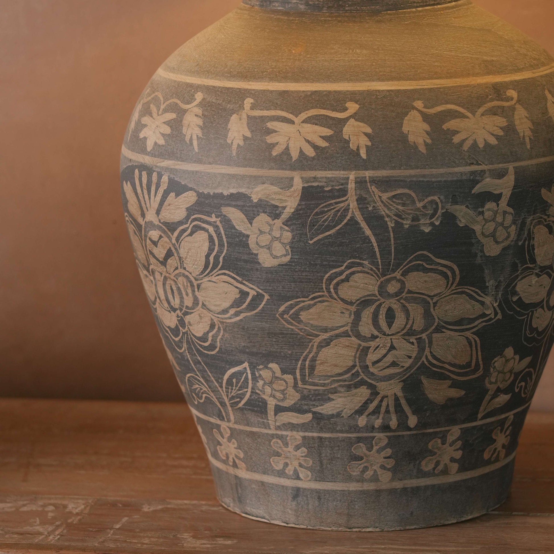 A handcrafted terracotta table lamp adorned with delicate floral motifs and a softly aged finish. Paired with a neutral fabric shade, it casts a warm, inviting glow. An elegant accent for consoles or bedside tables, blending artisanal detail with timeless, earthy charm for thoughtfully layered interiors.